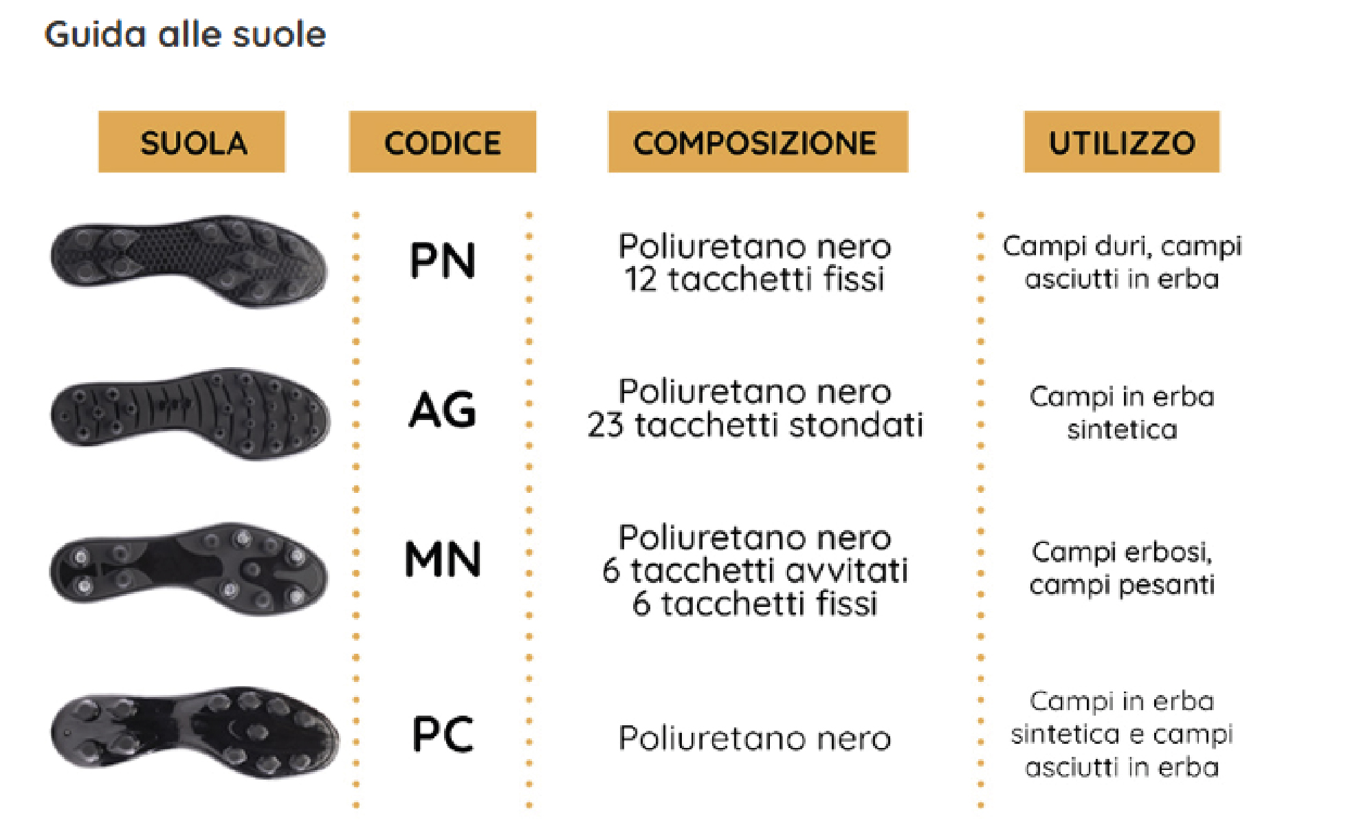 Scarpe calcioTipo terreno – AGTip terreno – MGTipo terreno – FGTipo terreno – HGTipo terreno – SGScarpe calcio a 5Da internoDa esterno